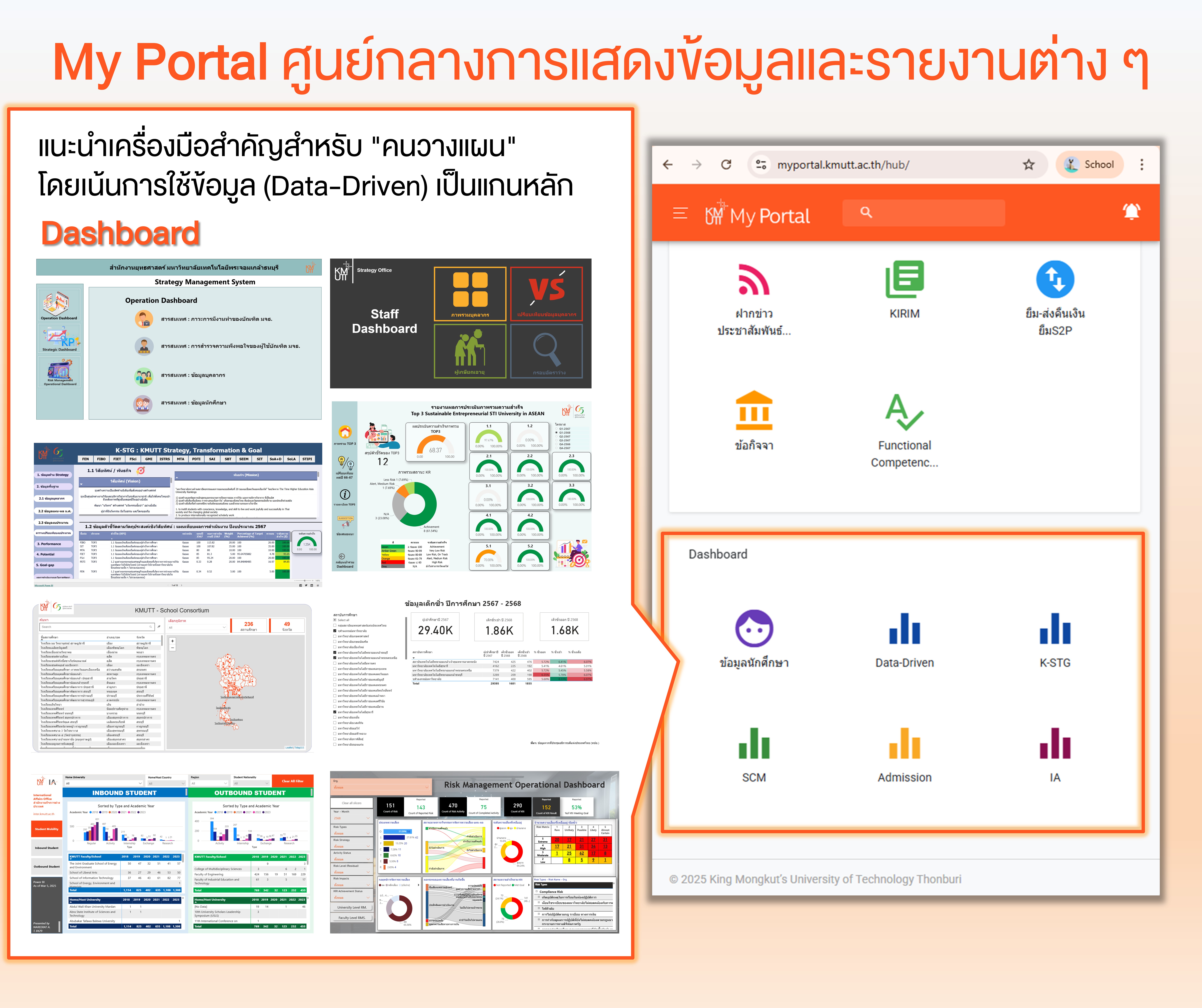 สำหรับบุคลากรของมหาวิทยาลัย สามารถเข้าถึง Dashboard อื่น ๆ เพิ่มเติมได้ที่ My Portal: https://myportal.kmutt.ac.th
